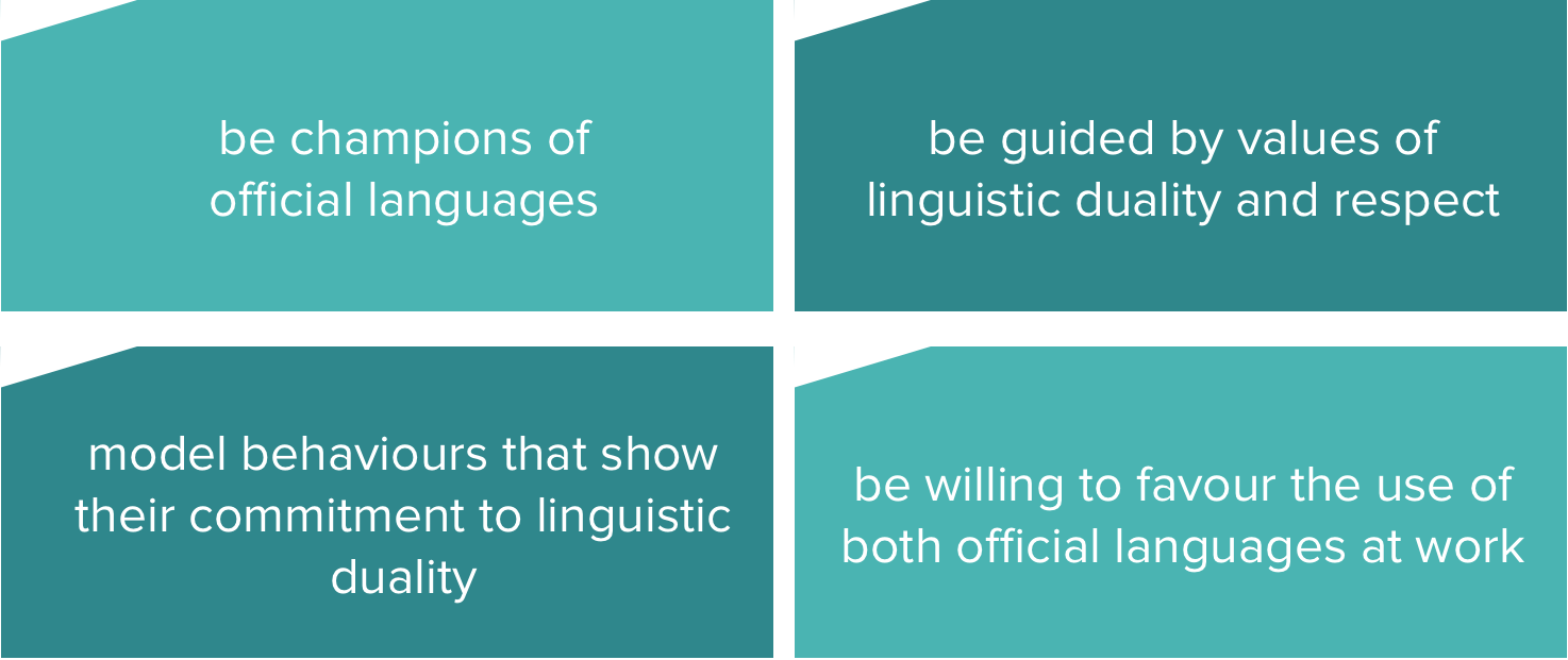 Managers have to support health care professionals with their responsibilities of active offer of French language services. Managers must: